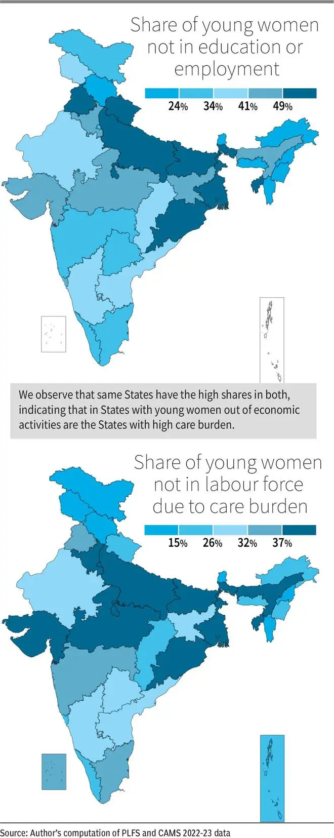 The picture does not change much across States. The PLFS data suggests that time spent by young women on giving care to family members is high in States where their participation in education or employment is low (see Figure). This correlation is more pronounced in rural areas. Four of every five young women in villages report not participating in education or employment due to being engaged in care activities within their household.