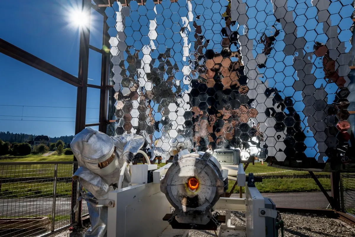 It consists of a 140-square-metre heliostat covered with movable mirrors, and a dish with a 10-metre diameter that focuses the Sun’s rays onto a crucible, where the metals are melted.